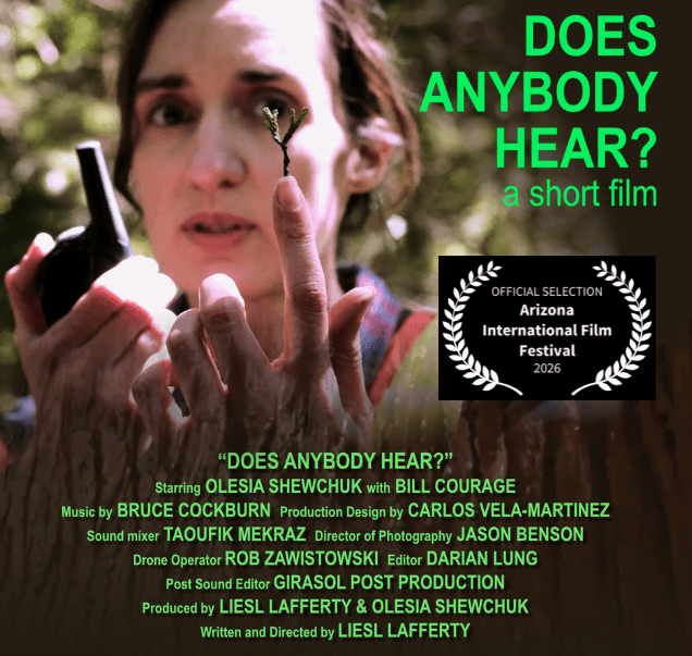 The title “Does Anybody Hear?” comes from a lyric in Canadian music icon and environmental activist Bruce Cockburn’s song “If a Tree Falls”. I wrote to his people to see if I could somehow use his incredible music in my piece. When their team heard my pitch, they granted me permission. I was thrilled.