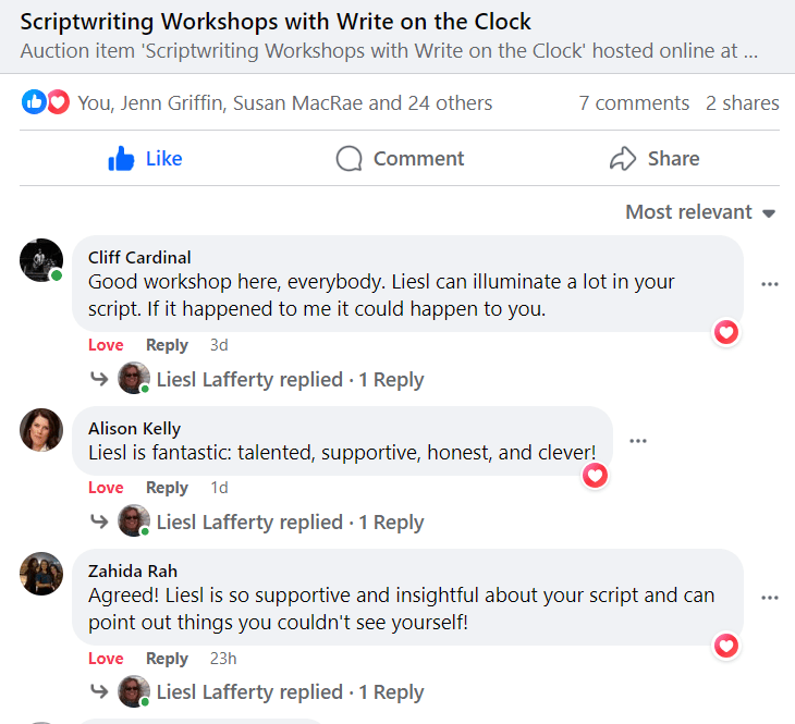 “Liesl’s Scriptwriting Workshop is a must for any writer with a project to finish. Hearing your work read aloud is a transformative experience. The high quality of feedback from the group is helpful and immediately actionable. Liesl’s experience and insights are worth the investment in yourself and your work.” Yvonne Shieck, Screenwriter